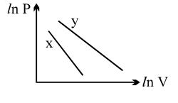 For two different gases $X$ and $Y$, having degrees of freedom $f_1$ and $f_2$ and molar heat capacities at constant volume $C_{V1}$ and $C_{V2}$ respectively, the ln $P$ versus ln $V$ graph is plotted for adiabatic process, as shown