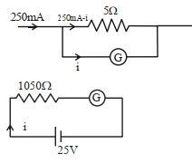 When a resistance of $5\,\Omega$ is shunted with a moving coil galvanometer, it shows a full scale deflection for a current of $250\,mA$, however when $1050\,\Omega$ resistance is connected with it in series, it gives full scale deflection for $25$ volt. The resistance of galvanometer is $......\,\Omega$.