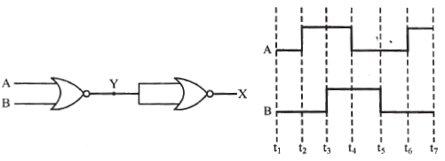Draw the output waveform at X, using the given inputs A and B for the logic circuit shown below. Also, identify the logic operation performed by this circuit.