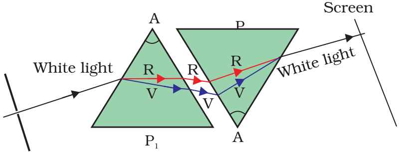 When we place a glass prism in the path of a narrow beam of white light a spectrum is obtained. What happens when a second identical prism is placed in an inverted position with respect to the first prism? Draw a labelled ray diagram to illustrate it.
