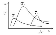 The plots of intensity versus wavelength for three black bodies at temperatures $T_1, T_2$ and $T_3$ respectively are as shown. Their temperature are such that