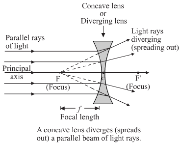When a beam of light rays parallel to one another and also to the principal axis of the concave lens fall on the lens, the incident rays pass through the lens and get refracted according to the laws of refraction. All the rays spread out after passing through the lens. These diverging rays when produced backwards appear to meet at a point F (focus) on the left side of the lens.