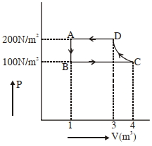 The $P-V$ diagram of a diatomic ideal gas system going under cyclic process as shown in figure. The work done during an adiabatic process $CD$ is (use $\gamma=1.4$) (in $J$)