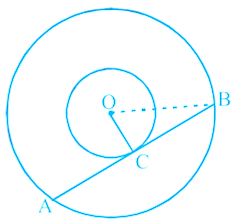 दो संकेंद्रीय वृत्तों में से बाहरी वृत्त की त्रिज्या $5 \ cm$ है तथा इसकी $8 \ cm$ लंबी जीवा $AC$ आंतरिक वृत्त की स्पर्श रेखा है। आंतरिक वृत्त की त्रिज्या ज्ञात कीजिए।