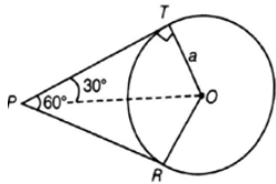 आइए हम एक वृत्त पर विचार करें जिसका केंद्र $O$ है और स्पर्श रेखाएँ $PT$ और $PR$ हैं और उनके बीच का कोण $60^\circ$ है और वृत्त की त्रिज्या $a$ है।