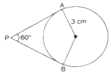यदि त्रिज्या $3 \ cm$ वाले एक वृत्त की दो स्पर्श रेखाएँ ऐसी खींची जाएँ कि उनके बीच का कोण $60^{\circ}$ हो, तो प्रत्येक स्पर्श रेखा की लंबाई होगी