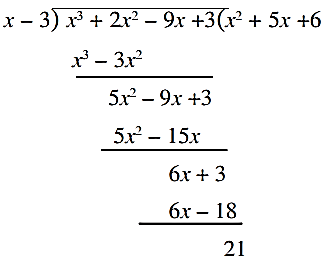 यदि $x^3 + 2x^2 + kx + 3$ को $x - 3$ से भाग देने पर शेषफल $21$ प्राप्त होता है, तो $k$ का मान और भागफल ज्ञात कीजिए। इसके बाद, त्रिघात बहुपद $x^3 + 2x^2 + kx - 18$ के शून्यक ज्ञात कीजिए।
