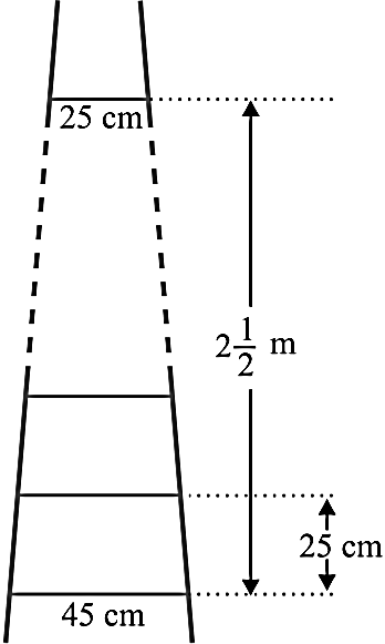 एक सीढ़ी के क्रमागत डंडे परस्पर $25 \ cm$ की दूरी पर हैं। $($देखिए आकृति$)$ डंडों की लंबाई एक समान रूप से घटती जाती है तथा सबसे निचले डंडे की लंबाई $45 \ cm$ है और सबसे ऊपर वाले डंडे की लंबाई $25 \ cm$ है। यदि ऊपरी और निचले डंडे के बीच की दूरी $2 \frac{1}{2} m$ है, तो डंडों को बनाने के लिए लकड़ी की कितनी लंबाई की आवश्यकता होगी?