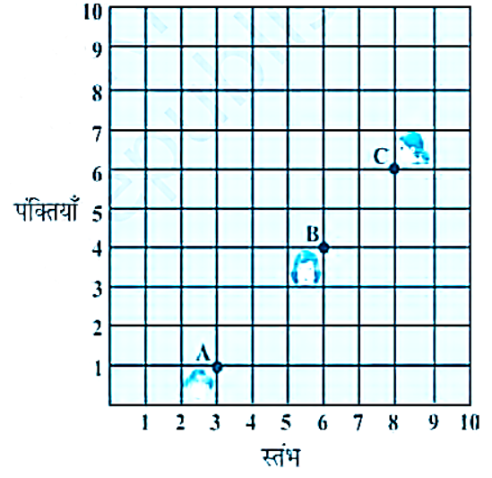आकृति में किसी कक्षा में रखे डेस्कों (desks) की व्यवस्था दर्शाती है। आशिमा, भारती और कैमिला क्रमशः A(3, 1), B(6, 4) और C(8, 6) पर बैठी हैं। क्या आप सोचते हैं कि वे एक ही सीध (in a line) में बैठी हैं? सकारण उत्तर दीजिए।
