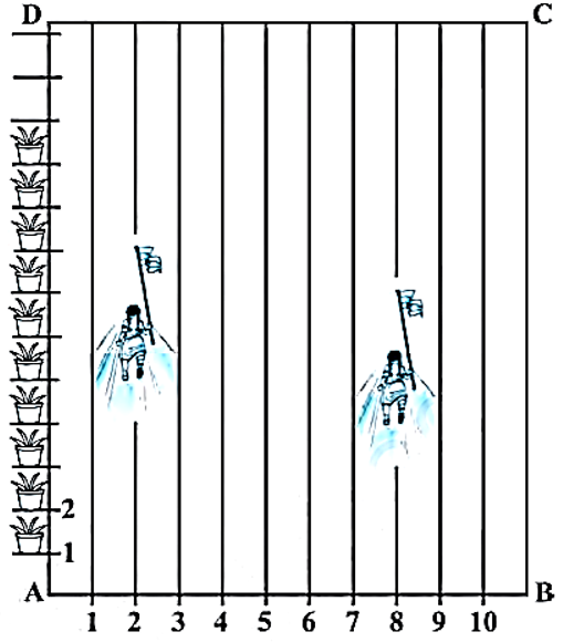 आपके स्कूल में खेल-कूद क्रियाकलाप आयोजित करने के लिए, एक आयताकार मैदान ABCD में, चूने से परस्पर 1 m की दूरी पर पंक्तियाँ बनाई गई हैं। AD के अनुदिश परस्पर 1 m की दूरी पर 100 गमले रखे गए हैं, जैसा कि आकृति में दर्शाया गया है। निहारिका दूसरी पंक्ति में AD के $\frac{1}{4}$ भाग के बराबर की दूरी दौड़ती है और वहाँ एक हरा झंडा गाड़ देती है। प्रीत आठवीं पंक्ति में AD के $\frac{1}{5}$ भाग के बराबर की दूरी दौड़ती है और वहाँ एक लाल झंडा गाड़ देती है। दोनों झंडों के बीच की दूरी क्या है? यदि रश्मि को एक नीला झंडा इन दोनों झंडों को मिलाने वाले रेखाखंड पर ठीक आधी दूरी (बीच में) पर गाड़ना हो तो उसे अपना झंडा कहाँ गाड़ना चाहिए?