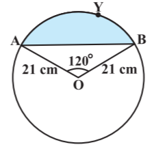 आकृति में दर्शाए गए वृत्तखंड का क्षेत्रफल ज्ञात कीजिए, यदि वृत्त की त्रिज्या $21 \ cm$ है और $\angle AOB = 120^\circ$ है। $[\pi = \frac{22}{7}$ लीजिए$]$