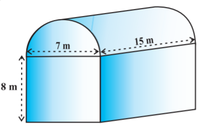 शांता किसी शेड $($shed$)$ में एक उद्योग चलाती है। यह शेड एक घनाभ के आकार का है जिस पर एक अर्धबेलन आरोपित है $($देखिए आकृति$)$। यदि इस शेड के आधार की विमाएँ $7 m \times 15 m$ हैं तथा घनाभाकार भाग की ऊँचाई $8 m$ है तो शेड में समावेशित हो सकने वाली हवा का आयतन ज्ञात कीजिए। पुन: यदि यह मान लें कि शेड में रखी मशीनरी $300 m^3$ स्थान घेरती है तथा शेड के अंदर $20$ श्रमिक हैं जिनमें से प्रत्येक $0.08 m^3$ के औसत से स्थान घेरता है तब शेड में कितनी हवा होगी?$ (\pi=\frac{22}{7}$ लीजिए$।)$