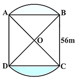 आकृति में, $56 m$ भुजा वाले एक वर्गाकार लॉन $($lawn$) \text{ABCD}$ के दो ओर बनी हुई दो वृत्ताकार फूलों की क्यारियाँ दर्शाई गई हैं। यदि प्रत्येक वृत्ताकार क्यारी का केंद्र लॉन के विकर्णों का प्रतिच्छेद बिंदु $O$ है, तो वर्गाकार लॉन तथा फूलों की क्यारियों के क्षेत्रफलों का योग ज्ञात कीजिए। $(\pi = \frac{22}{7}$ का प्रयोग कीजिए$)$।