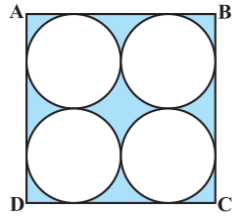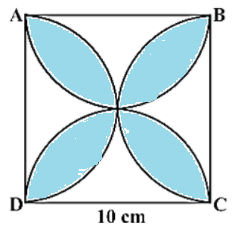 आकृति में, छायांकित डिज़ाइन का क्षेत्रफल ज्ञात कीजिए, जहाँ $\text{ABCD}$ भुजा $10 \ cm$ का एक वर्ग है तथा इस वर्ग की प्रत्येक भुजा को व्यास मान कर अर्धवृत्त खींचे गए हैं। $(\pi = 3.14$ का प्रयोग कीजिए।$)$
