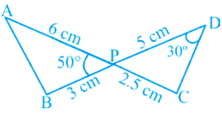 आकृति में, दो रेखाखंड $AC$ और $BD$ परस्पर बिंदु $P$ पर इस प्रकार प्रतिच्छेद करते हैं कि $PA = 6 \ cm, PB = 3 \ cm, PC = 2.5 \ cm, PD = 5 \ cm, \angle APB = 50^\circ$ और $\angle CDP = 30^\circ$ है तब$, \angle PBA$ बराबर है
