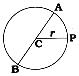 વર્તુળના કેન્દ્રમાંથી પસાર થતા વર્તુળ પરનાં બે બિંદુઓને જોડતો રેખાખંડ એ વર્તુળનો વ્યાસ છે. (આકૃતિમાં $AB¯$ એ વર્તુળનો વ્યાસ છે. $C $ એ તેનું કેન્દ્ર છે. ત્રિજ્યા $r$ ના સંદર્ભમાં વ્યાસ dને દર્શાવો.)